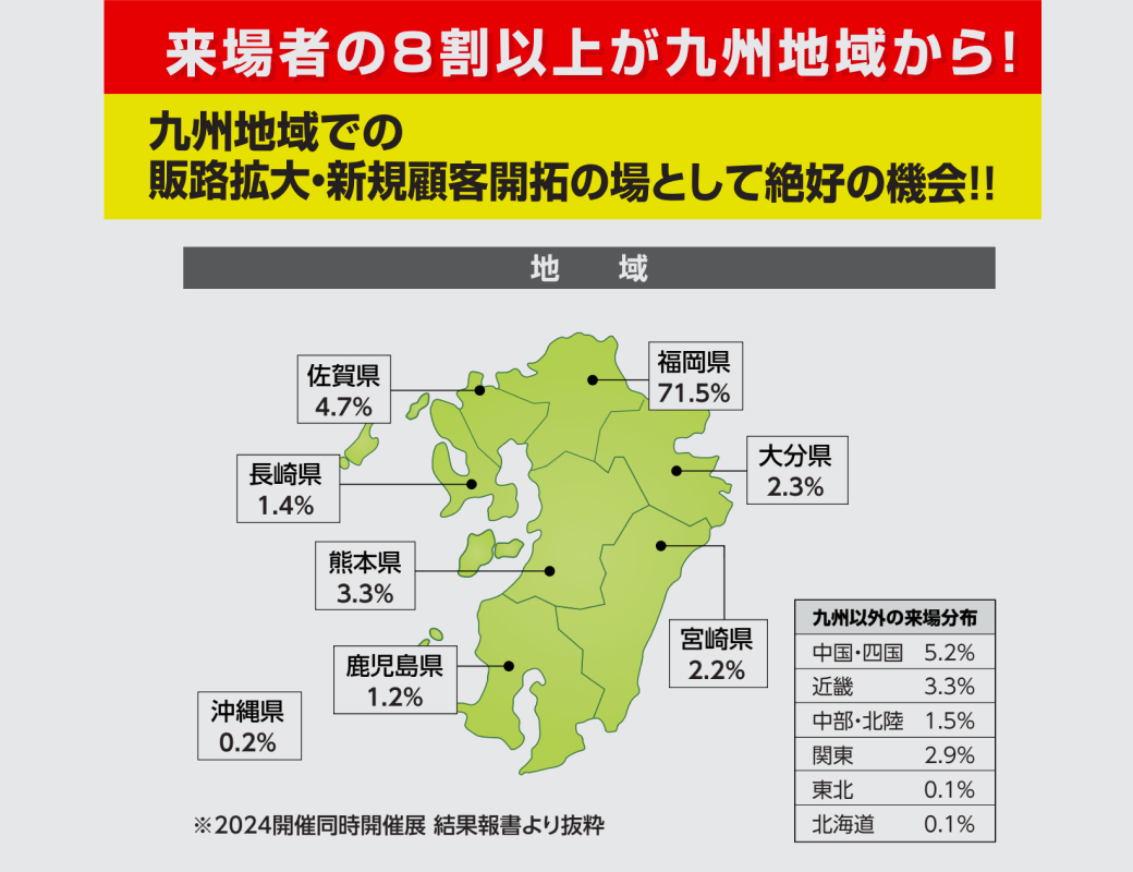 国際物流総合展としては九州で初開催となりますが、猛暑対策展、建設開発総合展、ホーム&ビルディングショーなどまちづくりをテーマとした物流と関連性のある5つの実績のある展示会と同時開催するため、幅広い業界からの来場者が見込めます。(2025年実績:6,374 名)8割以上が九州地域からの来場のため、九州地域での販路開拓・新規顧客開拓の場として絶好の機会です。